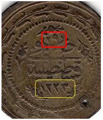 Bottom Year of issue: 1223 + 29 = 1252 AH = 1836 AD More modern coins can feature the date of issue in AH and/or AD format, using Arabic and/or Western numbers. |