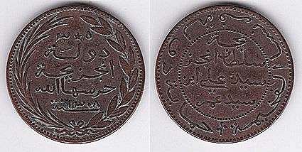 ![]() km1 5 Centimes (AH1308) 1890 | ![]() km2 10 Centimes (AH1308) 1890 | ![]() km4 1 Franc (1964) | ||