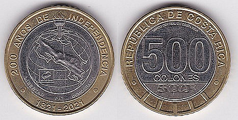 ![]() km239.1 500 Colones (2003-2006) thick numerals | ![]() km239.1a 500 Colones (2006--) brass plated steel | ![]() km241 500 Colones (2021) Bicentenary of Independence | ||