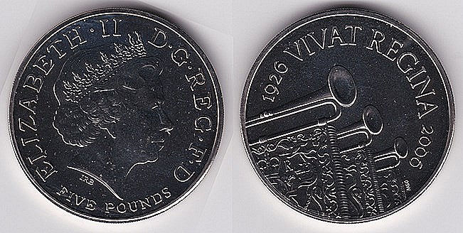 ![]() km1035 5 Pounds (ND 2002) Queen Mother 1900-2002 | ![]() km1038 5 Pounds (2003) Queens Golden Jubilee | ![]() km1055 5 Pounds (2004) Entente Cordiale | ||