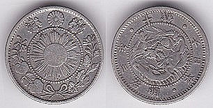 ![]() y25 50 Sen (1873-1905) silver | ![]() y31 50 Sen (1906-1912) | ![]() y37.1 50 Sen (1912-1917) | ||