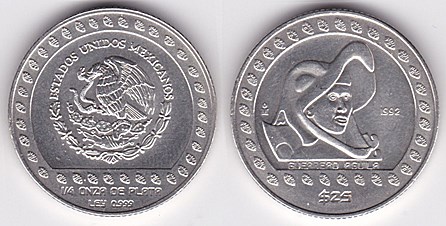 ![]() km604 2 Pesos (1996--) | ![]() km463 2 1/2 Pesos (1918-1948) gold | ![]() km465 5 Pesos (1947-1948) Cuauhtemoc | ||