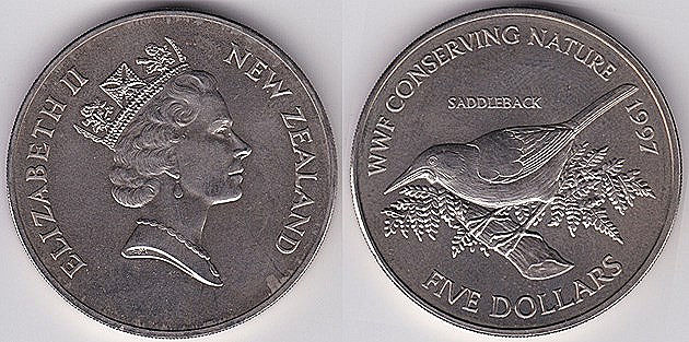 ![]() km80 5 Dollars (1991) Rugby World Cup | ![]() km82 5 Dollars (1992) 25 yrs Decimal Currency | ![]() km103 5 Dollars (1997) Saddleback bird | ||