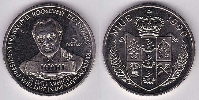 ![]() km35 5 Dollars (1990) Franklin D. Roosevelt | ![]() km37 5 Dollars (1990) Winston Churchill | ![]() km33 5 Dollars (1990) Admiral Halsey | ||