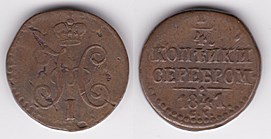 ![]() c142 1/4 Kopek (1840-1843) | ![]() km187 1 Polushka (1730-1754) | ![]() c147.1 1 Polushka=1/4 Kopek (1850-1855) | ||