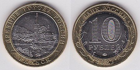 ![]() y1275 10 Roubles (2010) City of Bryansk | ![]() y1276 10 Roubles (2010) City of Yurjevets | ![]() y1283 10 Roubles (2011) City of Solikamsk | ||