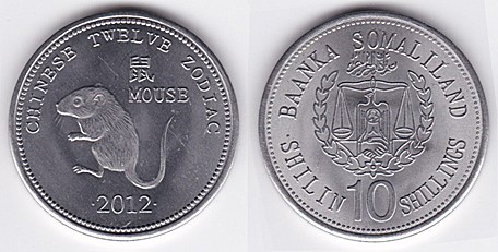 ![]() km62 10 Shillings (2012) Monkey | ![]() km63 10 Shillings (2012) Mouse | ![]() km64 10 Shillings (2012) Ox | ||