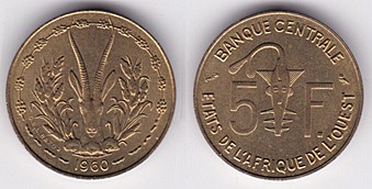 ![]() km2 5 Francs (1960) | ![]() km2a 5 Francs (1965--) | ![]() km1 10 Francs (1959,1964) aluminum-bronze | ||