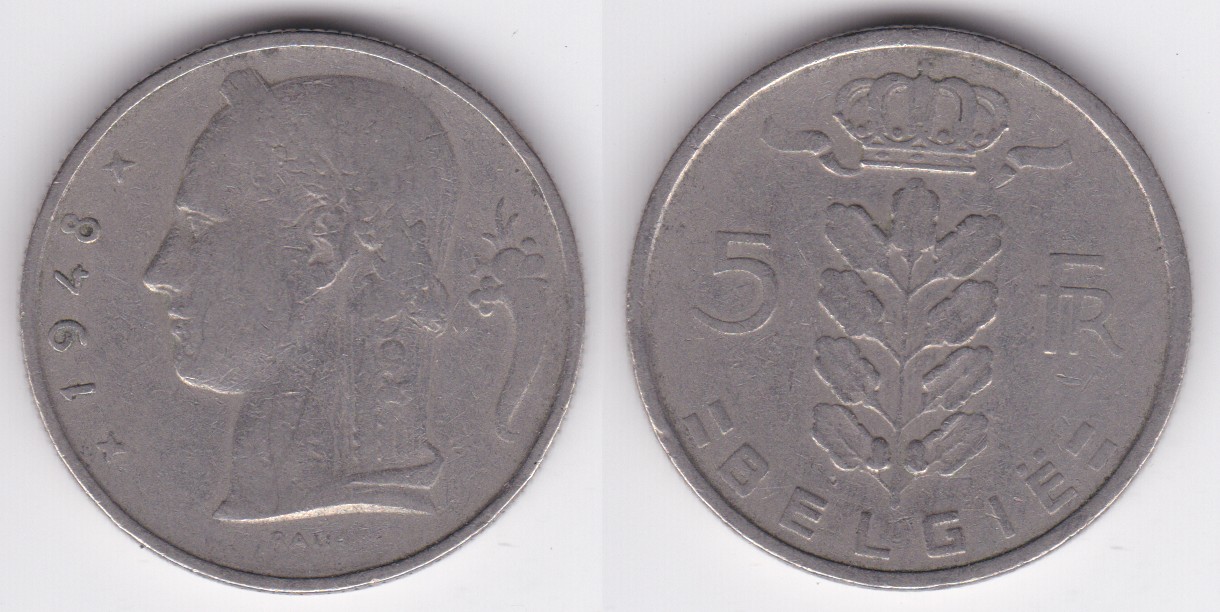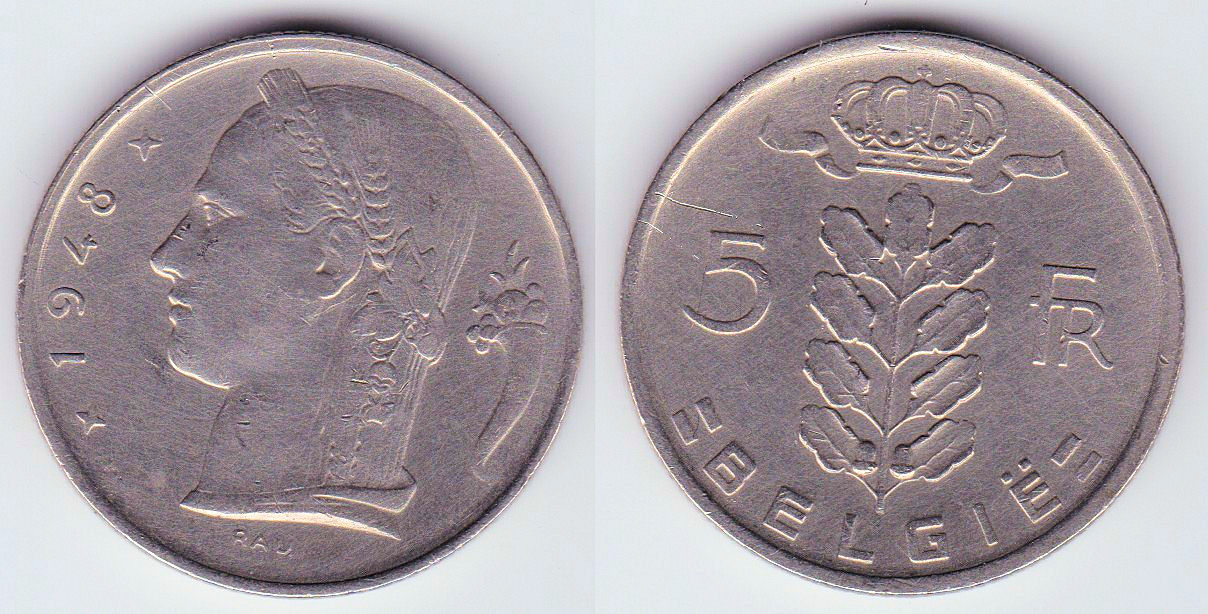 ![]() | 109736 | Belgium | 1948 | km135.1 | 5 Francs (1948-1981) Belgie | $1.50 | A |