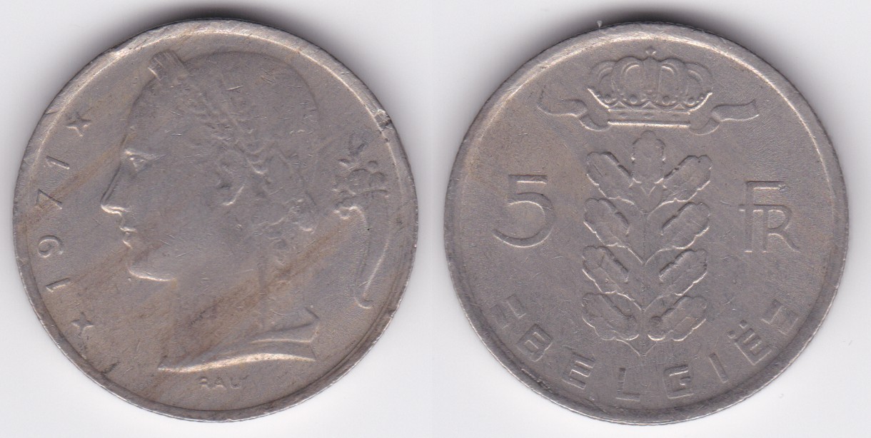 ![]() | 110253 | Belgium | 1971 | km135.1 | 5 Francs (1948-1981) Belgie | $0.25 | A |