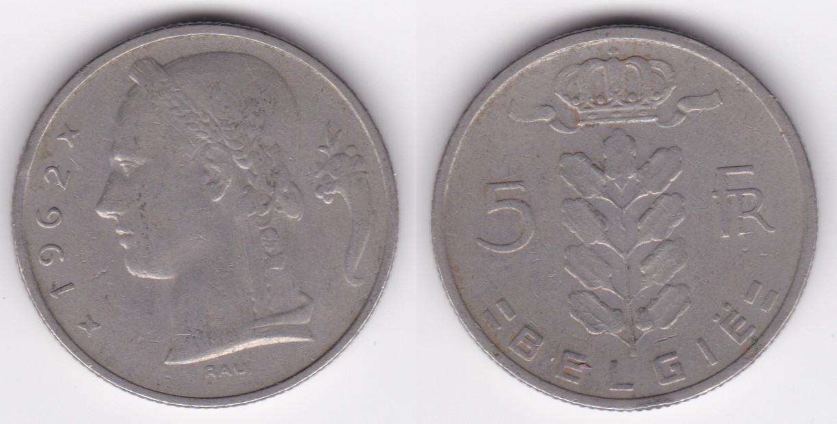 ![]() | 112108 | Belgium | 1962 | km135.1 | 5 Francs (1948-1981) Belgie | $0.50 | A |