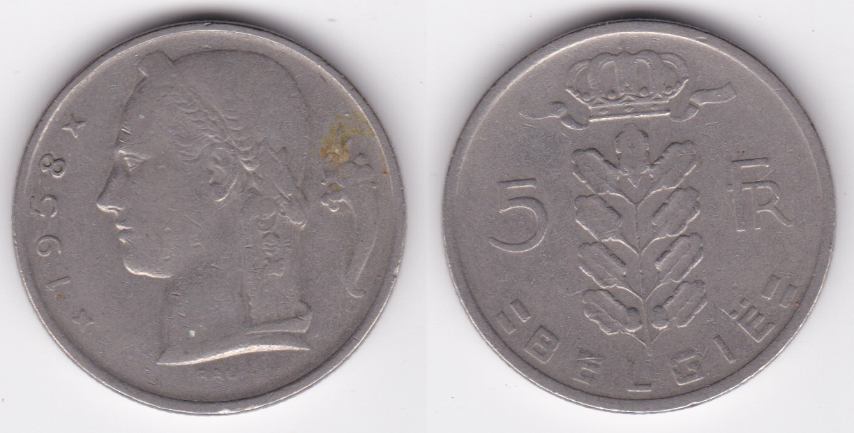 ![]() | 112455 | Belgium | 1958 | km135.1 | 5 Francs (1948-1981) Belgie | $1.00 | A |