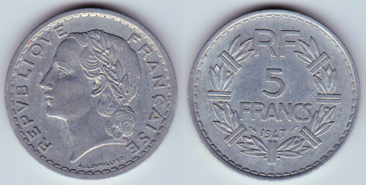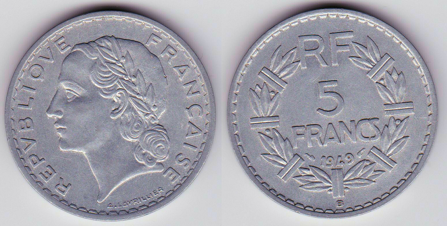 ![]() | 73251 | France | 1947-B | km888b.2 | 5 Francs (1945-1950) mintmark B (10 available) | $0.25 | A |