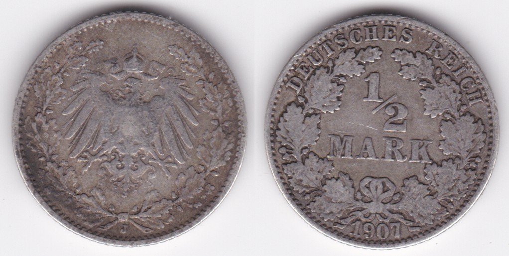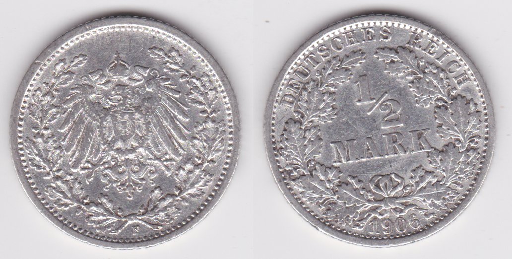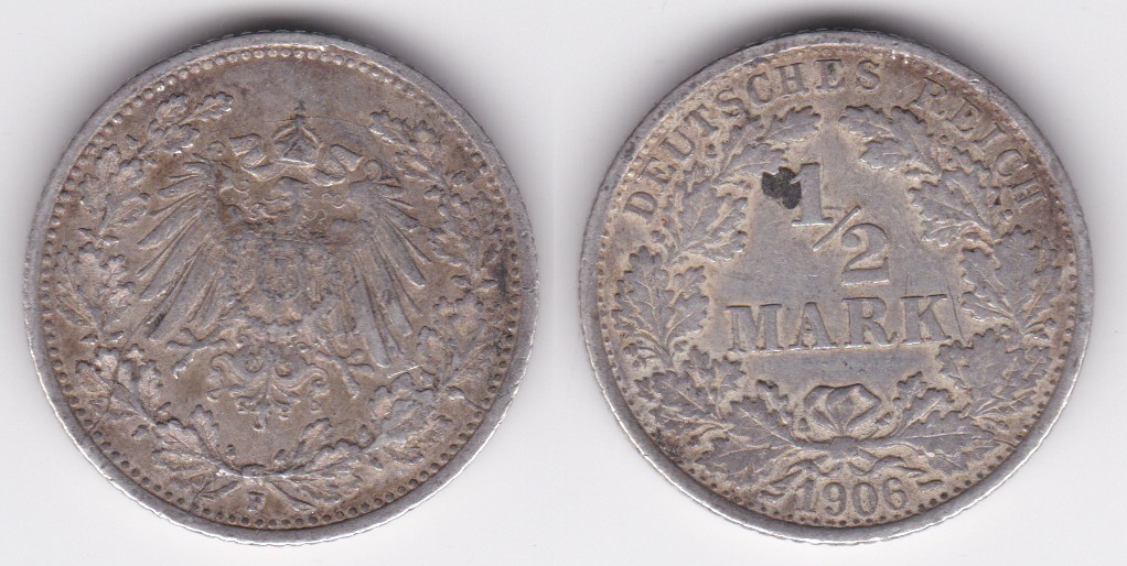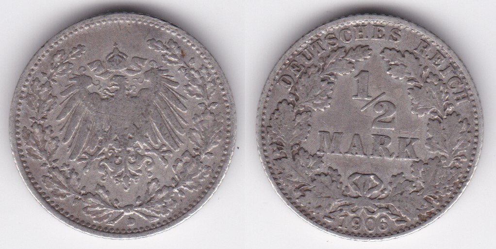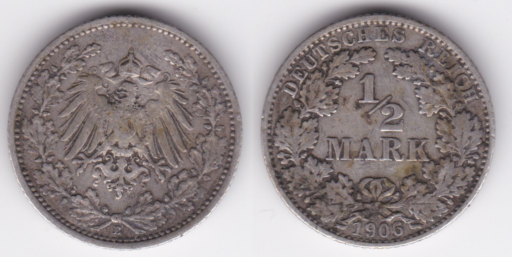![]() | 111985 | German Empire | 1906-E | km17 | 1/2 Mark (1905-1919) | $5.00 | A |