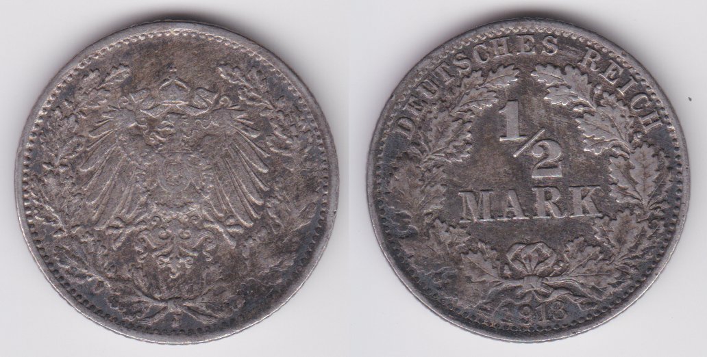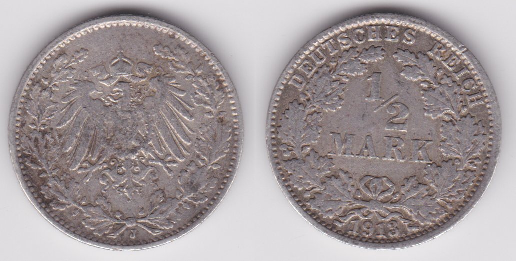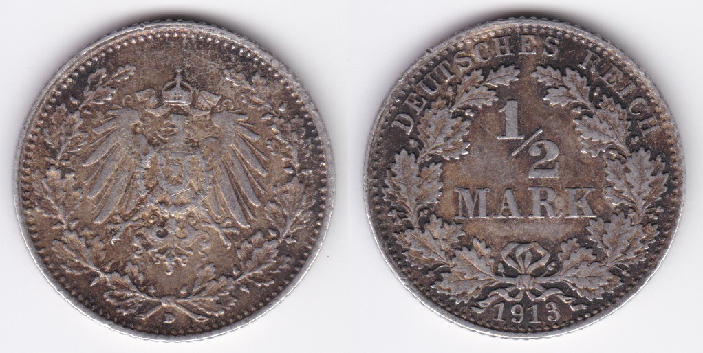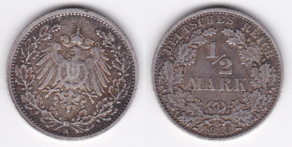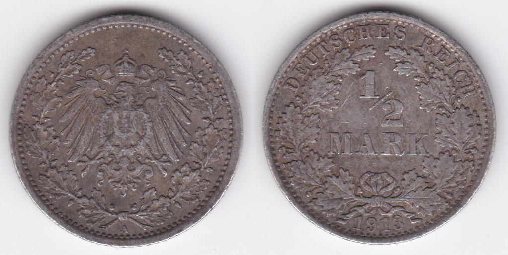 ![]() | 111995 | German Empire | 1913-A | km17 | 1/2 Mark (1905-1919) | $5.00 | A |