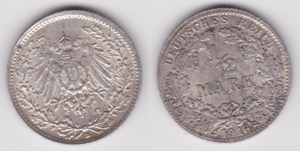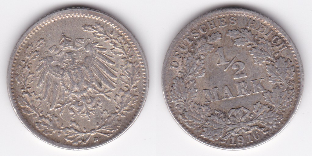 ![]() | 105158 | German Empire | 1916-D | km17 | 1/2 Mark (1905-1919) | $6.00 | A |
