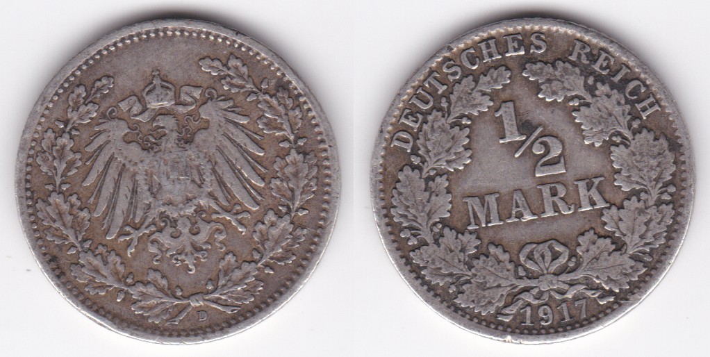 ![]() | 112007 | German Empire | 1917-D | km17 | 1/2 Mark (1905-1919) | $5.00 | A |