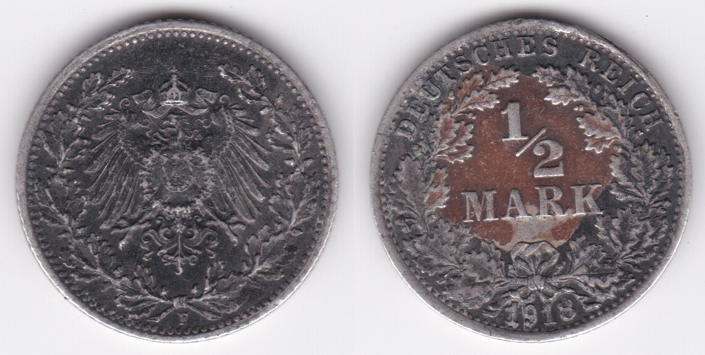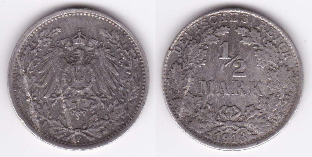 ![]() | 112010 | German Empire | 1918-F | km17 | 1/2 Mark (1905-1919) | $12.00 | A |