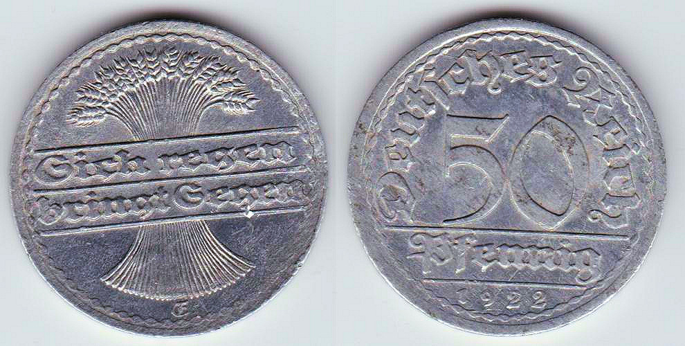 ![]() | 69722 | German Weimar Republic | 1922-F | km27 | 50 Pfennig (1919-1922) | $0.75 | A |