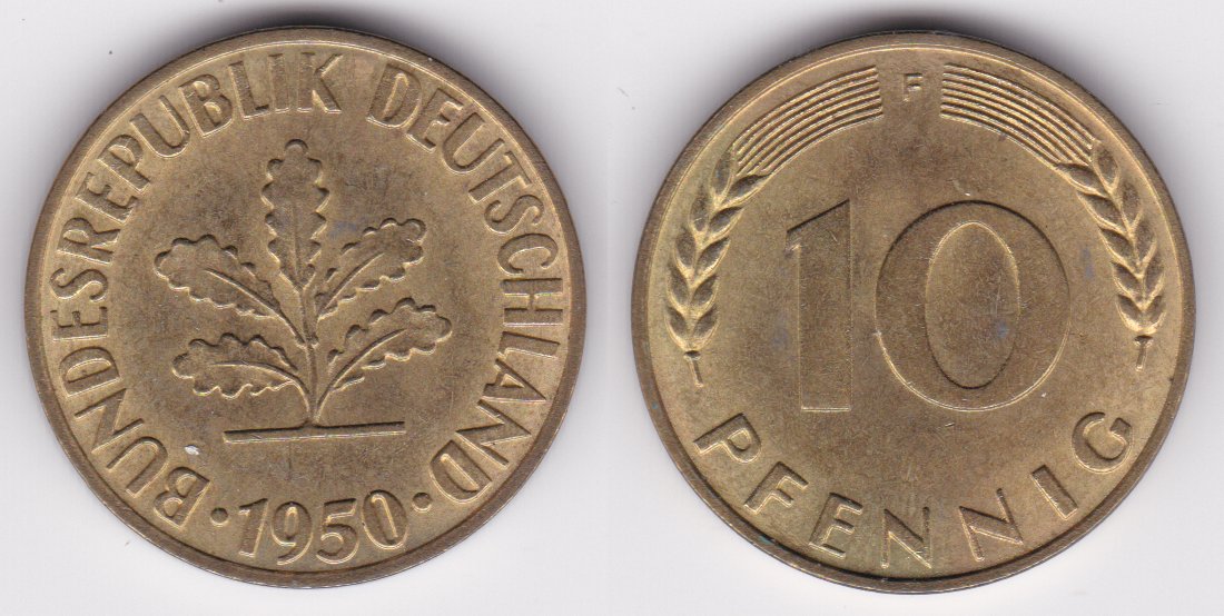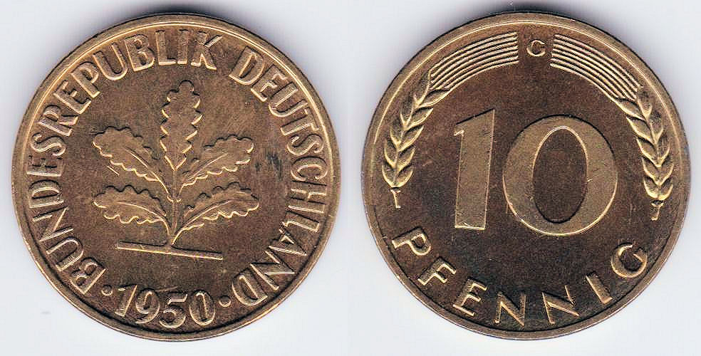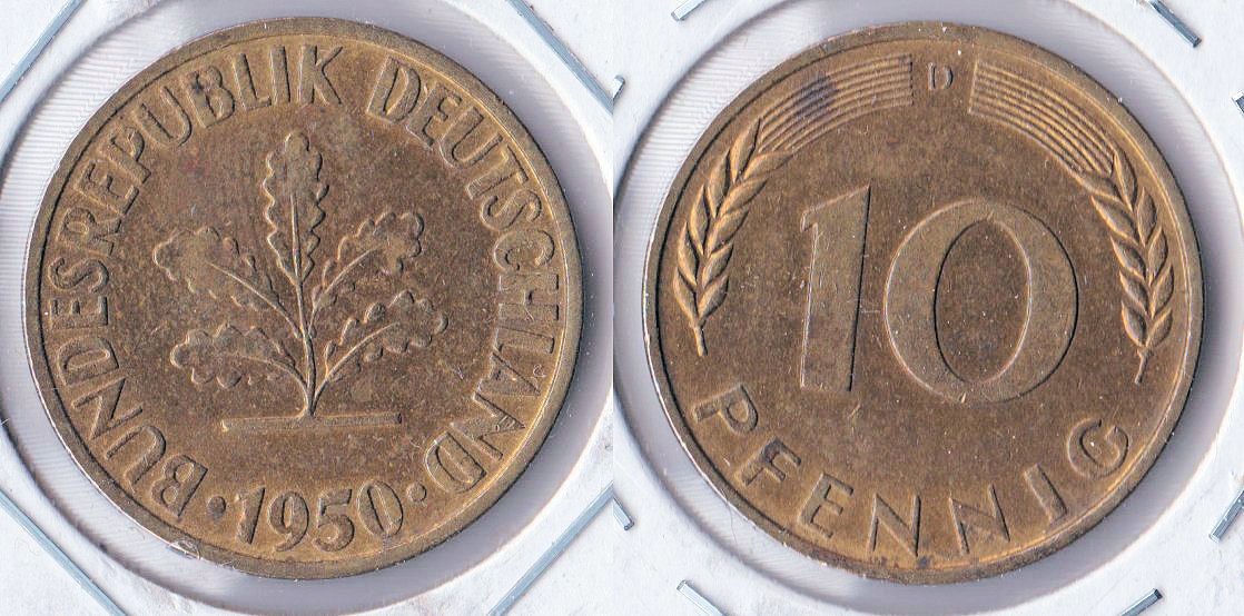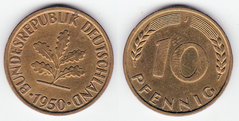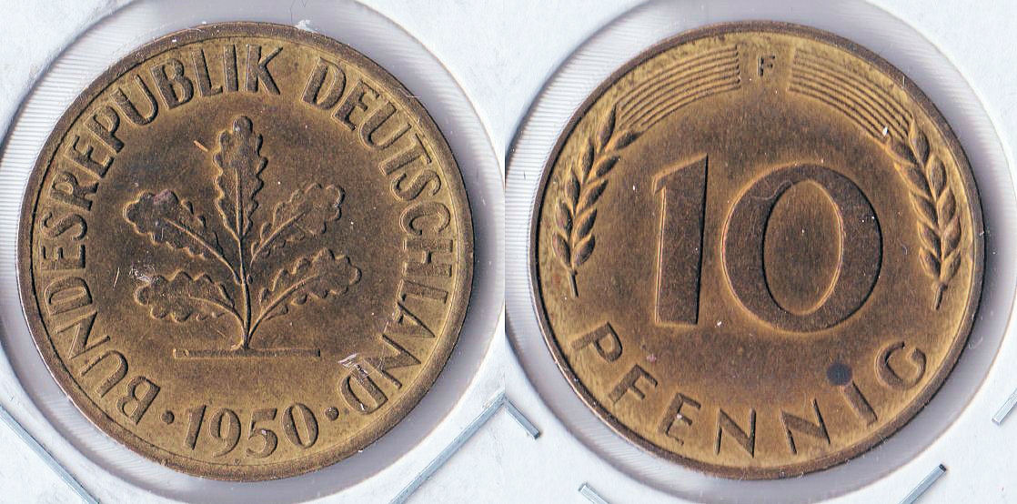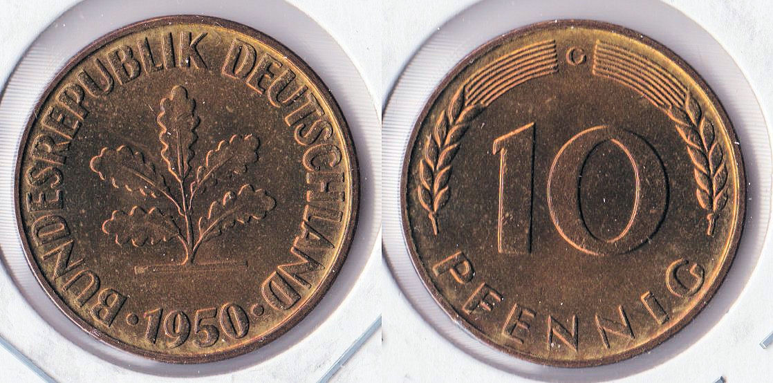 ![]() | 69597 | German Federal Republic | 1950-J | km108 | 10 Pfennig (1950-2001) (2 available) | $0.25 | A |