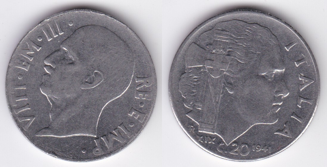 ![]() | 109780 | Italy | 1940 | km75b | 20 Centesimi (1939-1943) reeded edge | $0.25 | A |