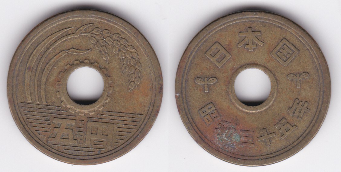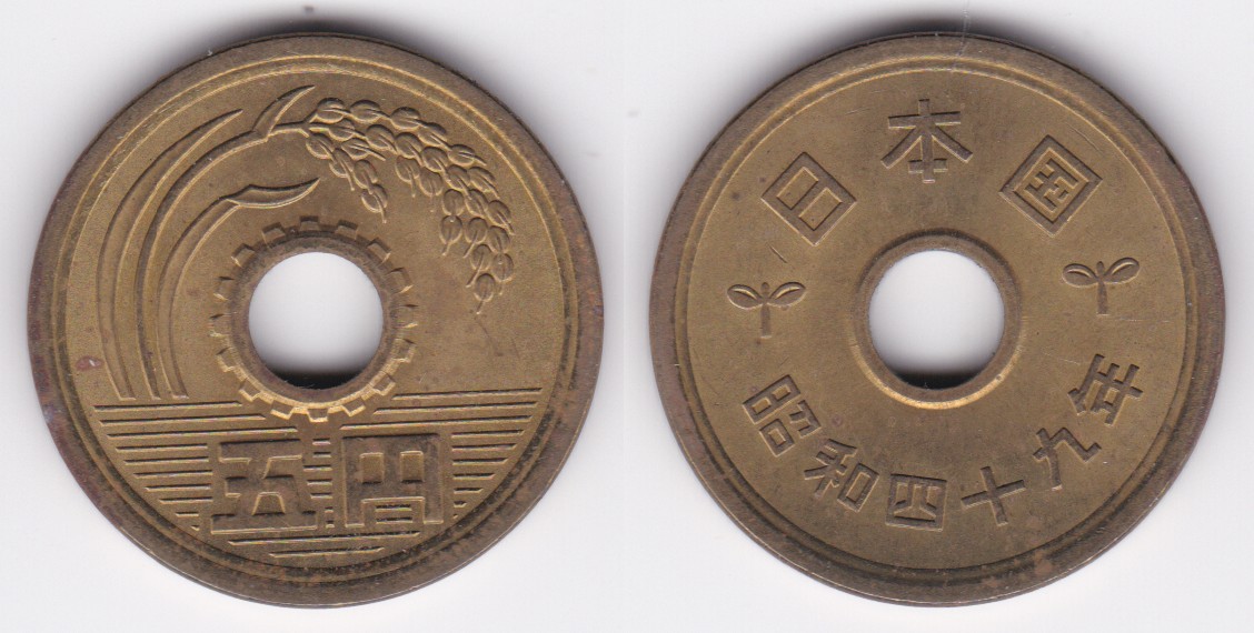 | 113211 | Japan | 1974 | y72a | 5 Yen (1959-1989) new script | $0.50 | A |