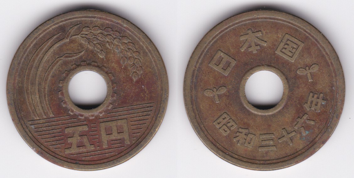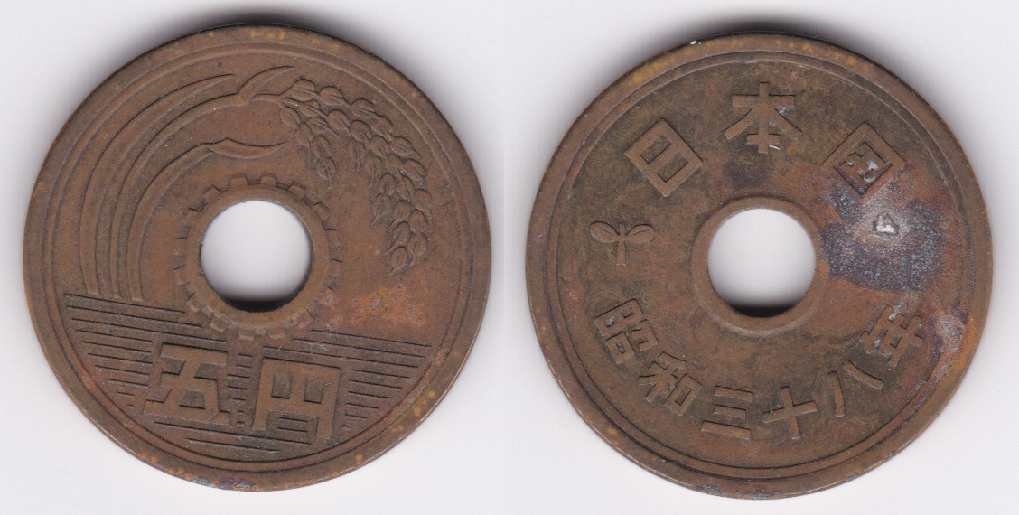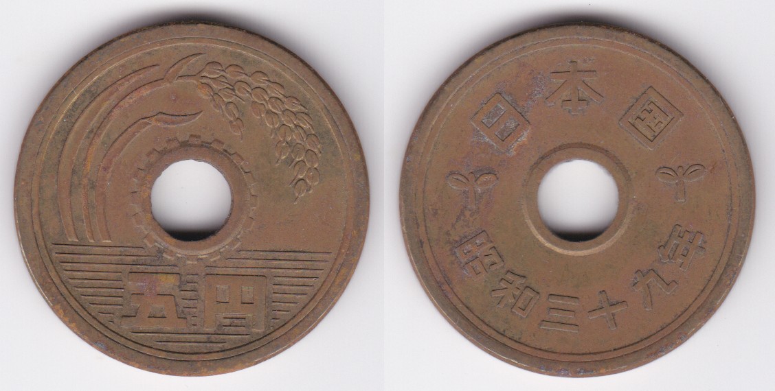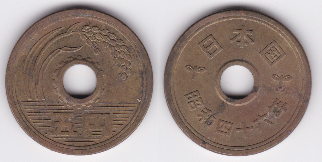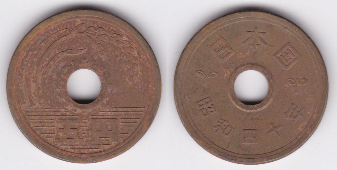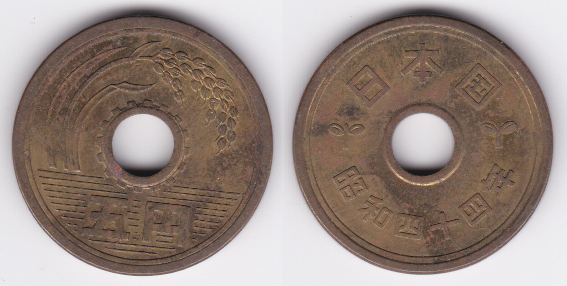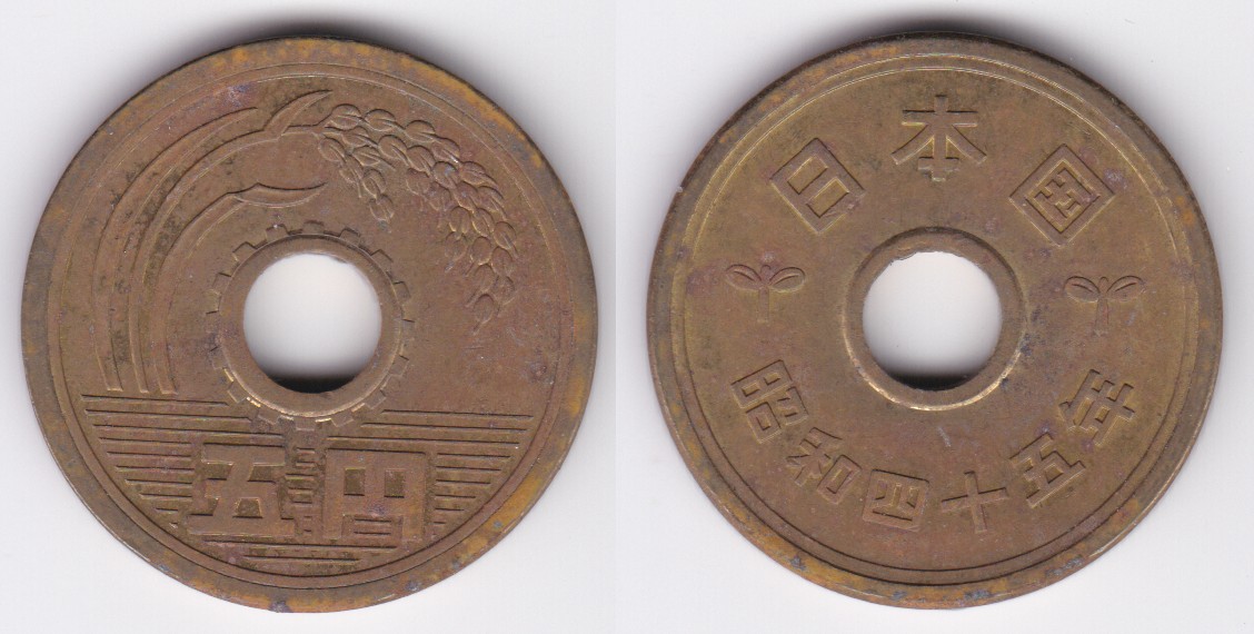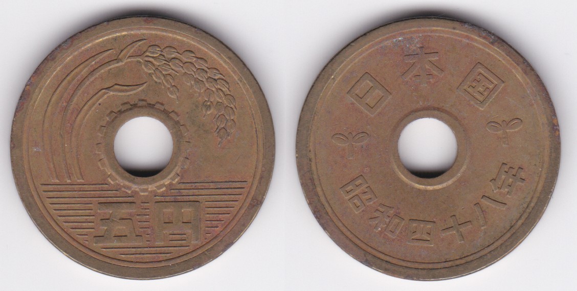 | 108906 | Japan | 1972 | y72a | 5 Yen (1959-1989) new script | $0.25 | A |