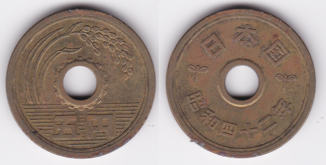 | 113204 | Japan | 1965 | y72a | 5 Yen (1959-1989) new script | $0.25 | A |