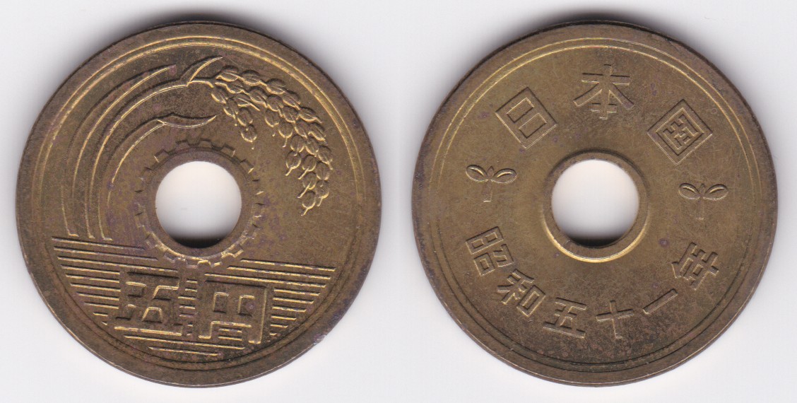 | 113212 | Japan | 1976 | y72a | 5 Yen (1959-1989) new script | $0.50 | A |