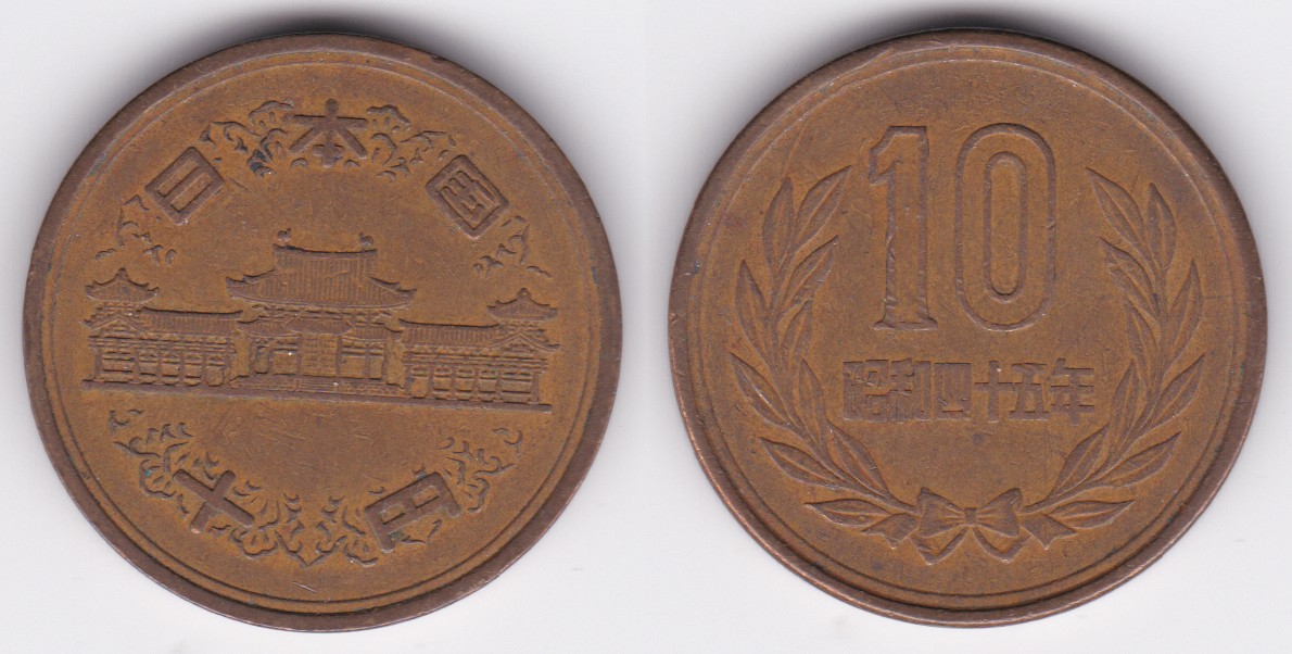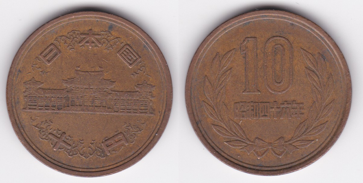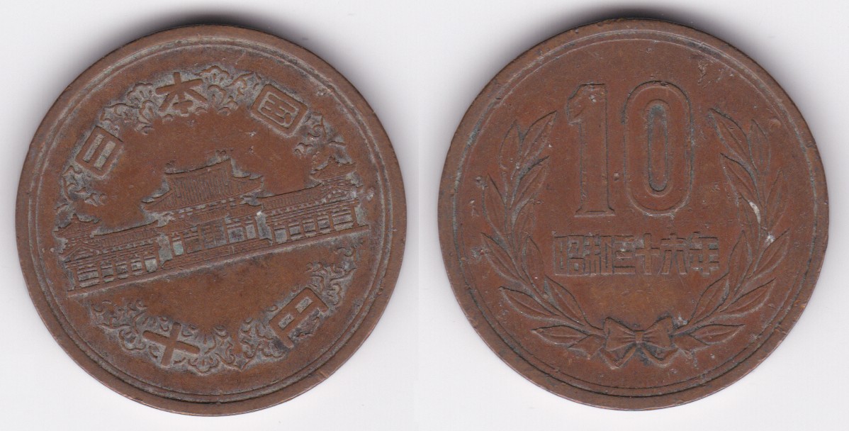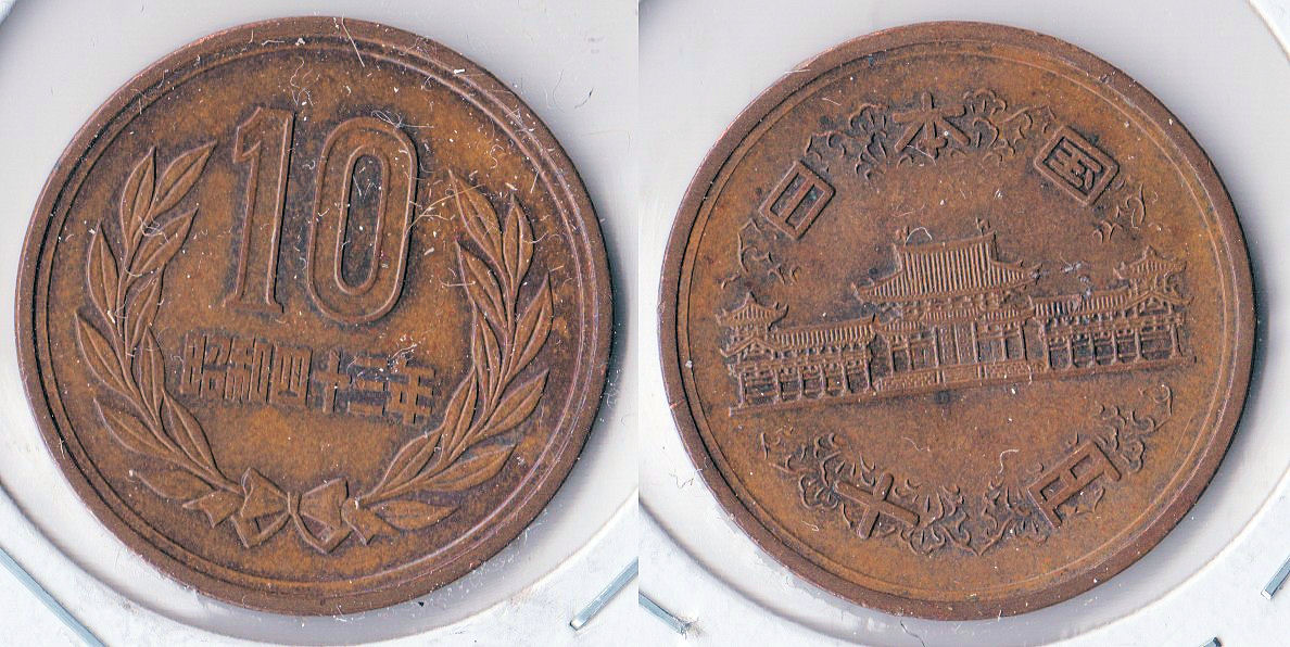![]() | 111749 | Japan | 1971 | y73a | 10 Yen (1959-1988) plain edge | $0.25 | A |