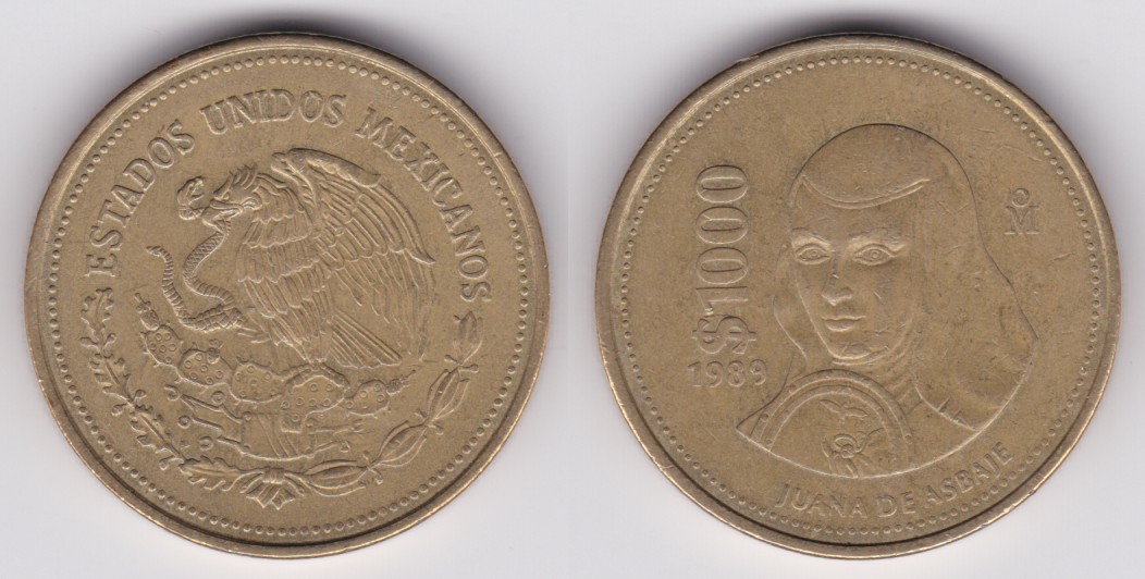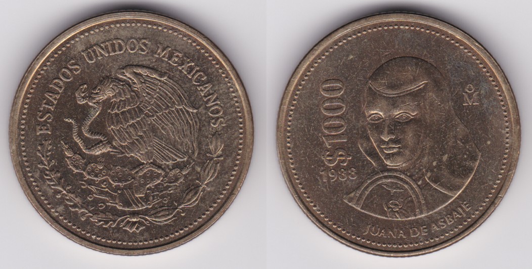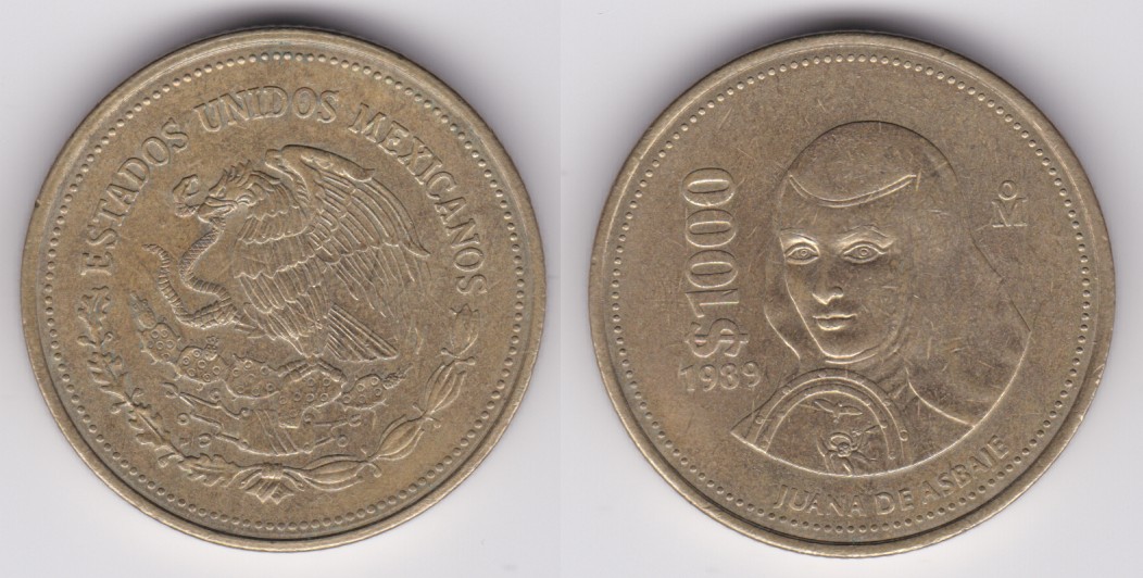 ![]() | 113164 | Mexico | 1989 | km536 | 1000 Pesos (1988-1992) Sor Juana Ines de la Cruz (2 available) | $5.00 | A |