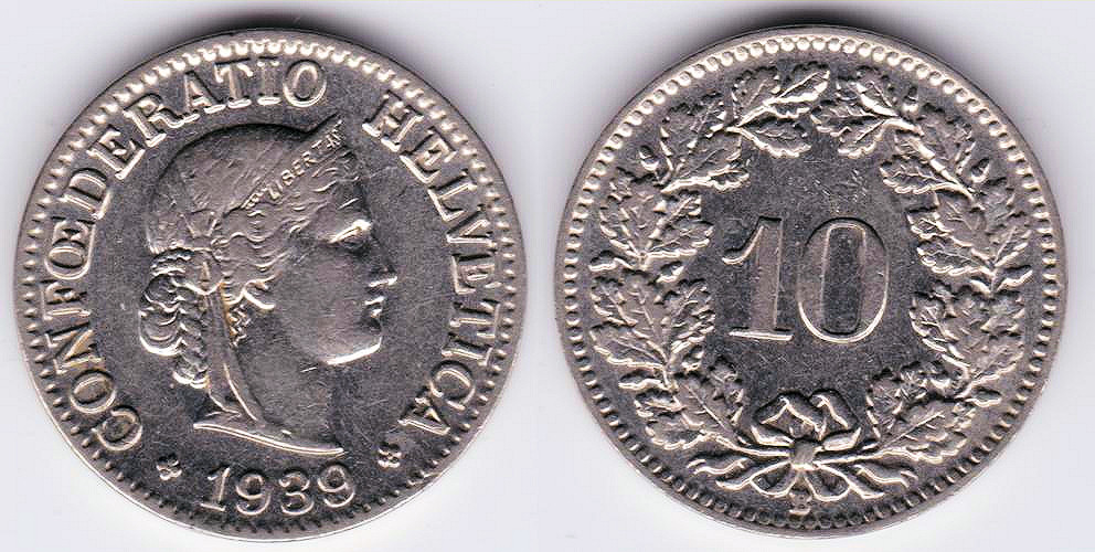 ![]() | 67842 | Switzerland | 1938 | km27b | 10 Rappen (1932-1939) nickel (2 available) | $1.75 | A |