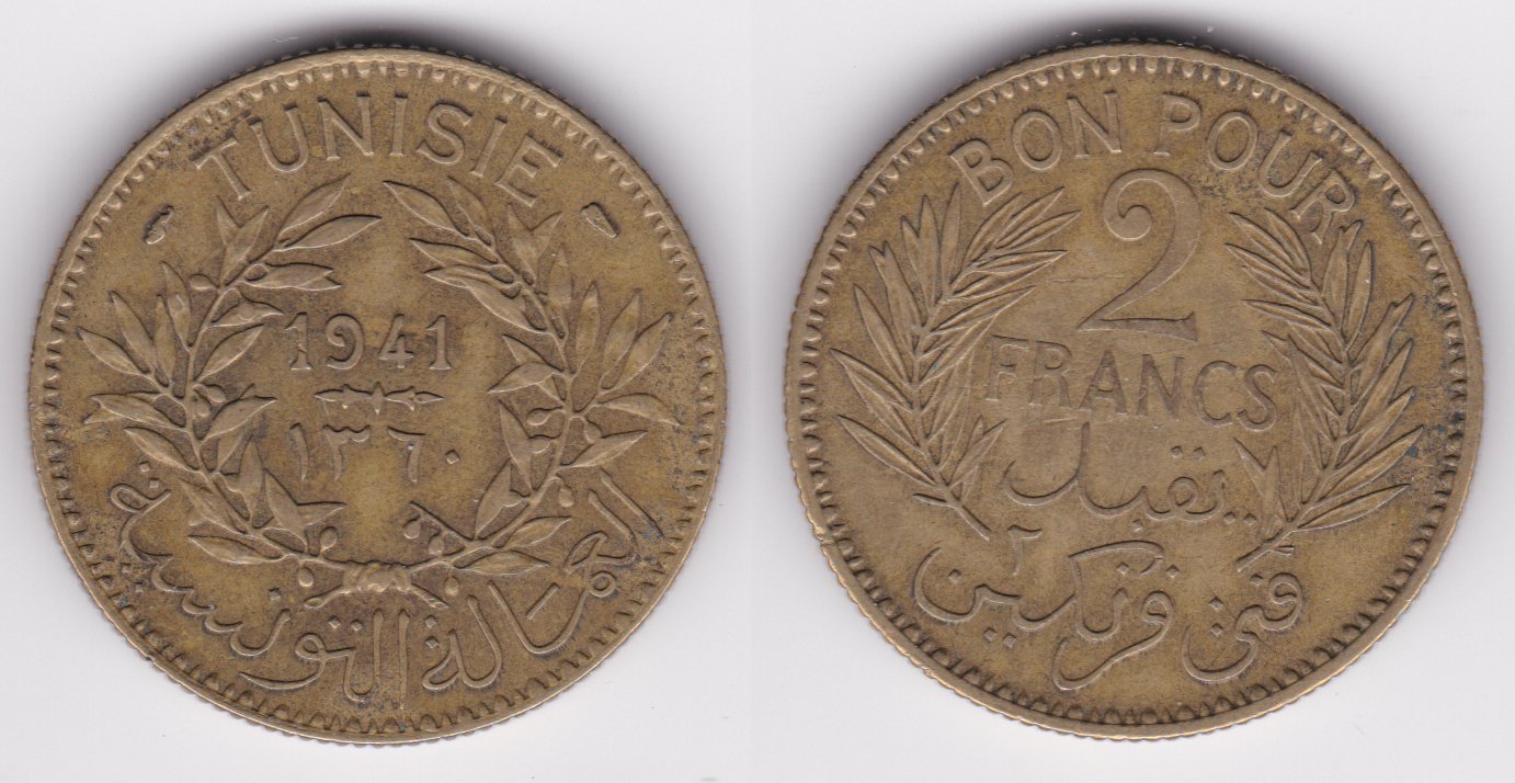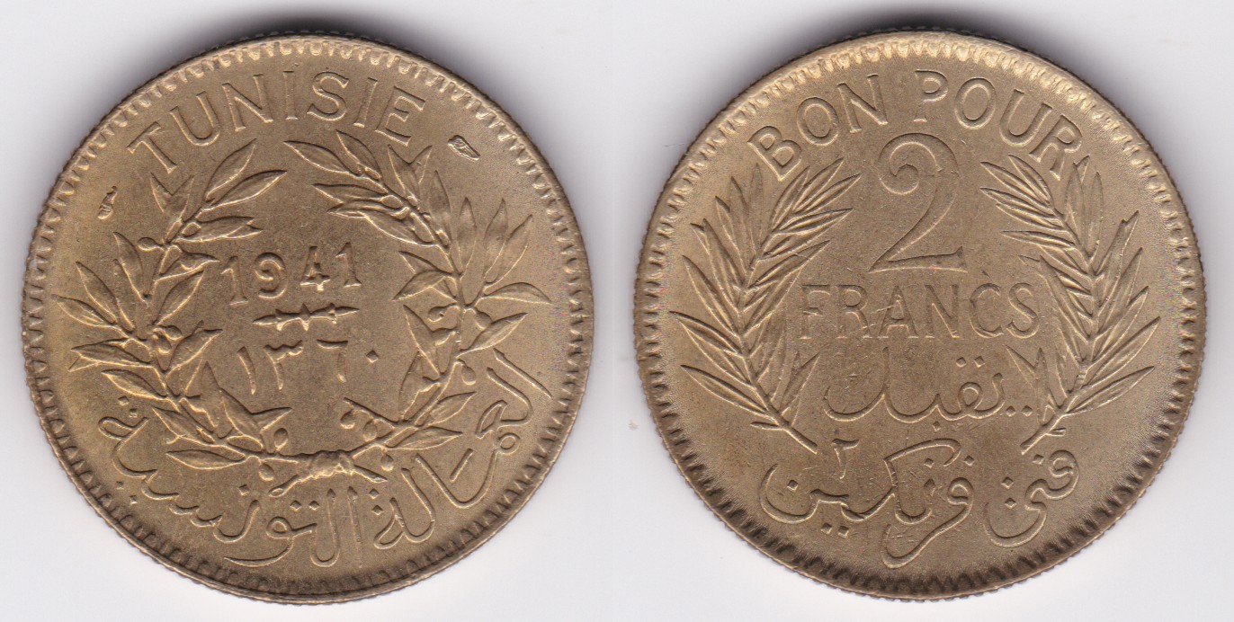 ![]() | 104804 | Tunisia | 1941 | km248 | 2 Francs (1921-1945) al-bronze | $2.50 | A |