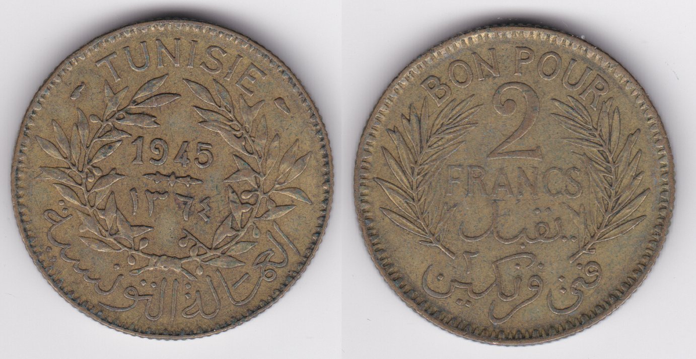 ![]() | 104806 | Tunisia | 1945 | km248 | 2 Francs (1921-1945) al-bronze | $1.75 | A |