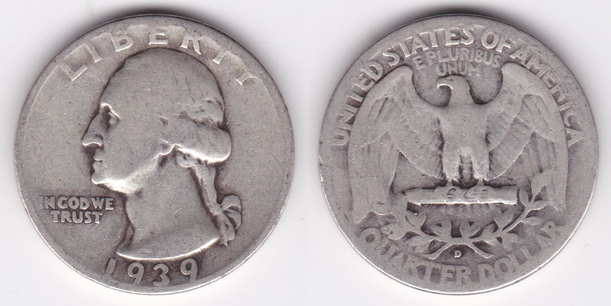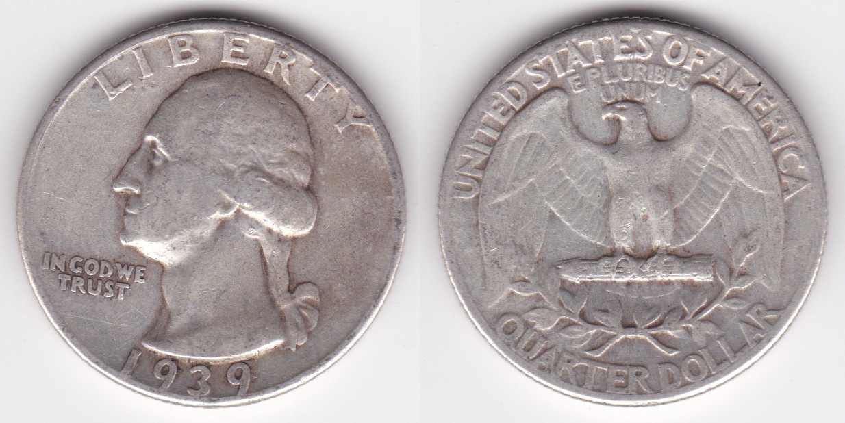 ![]() | 112850 | United States of America | 1939 | km164 | quarter dollar (1932-1964) Washington silver | $10.00 | A |